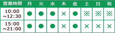 平日 10:00~12:30 15:00~21:00※土日祝 9:00~14:00(休診日 木曜)